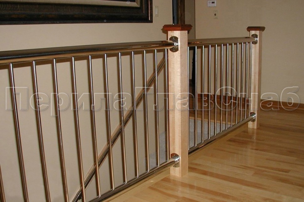 Нержавеющие ограждения без ригелей с круглым поручнем и стойками с деревянными вставками