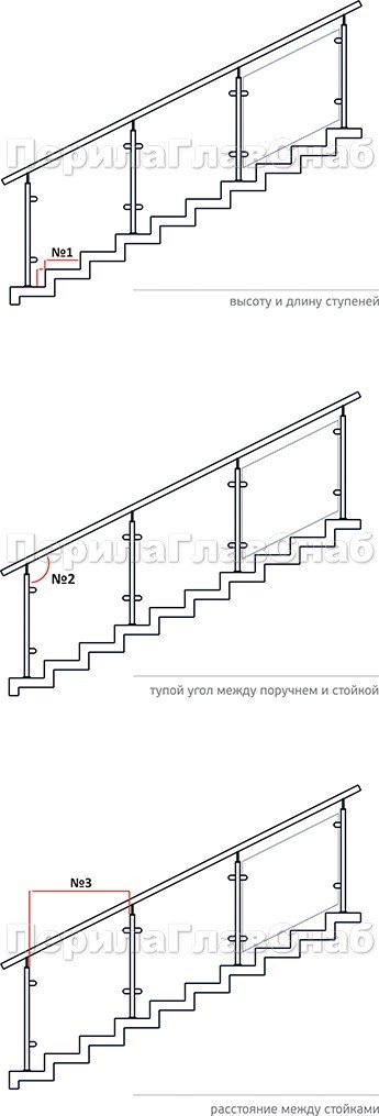 На зарисовке обязательно расположите точное количество стоек и ступеней между стойками. Исходя из этих данных, можно вычислить длину и высоту стекла.