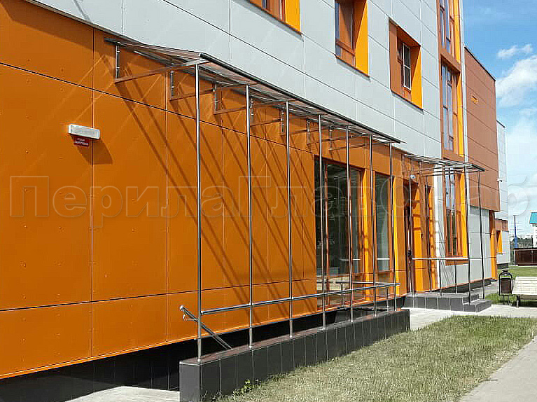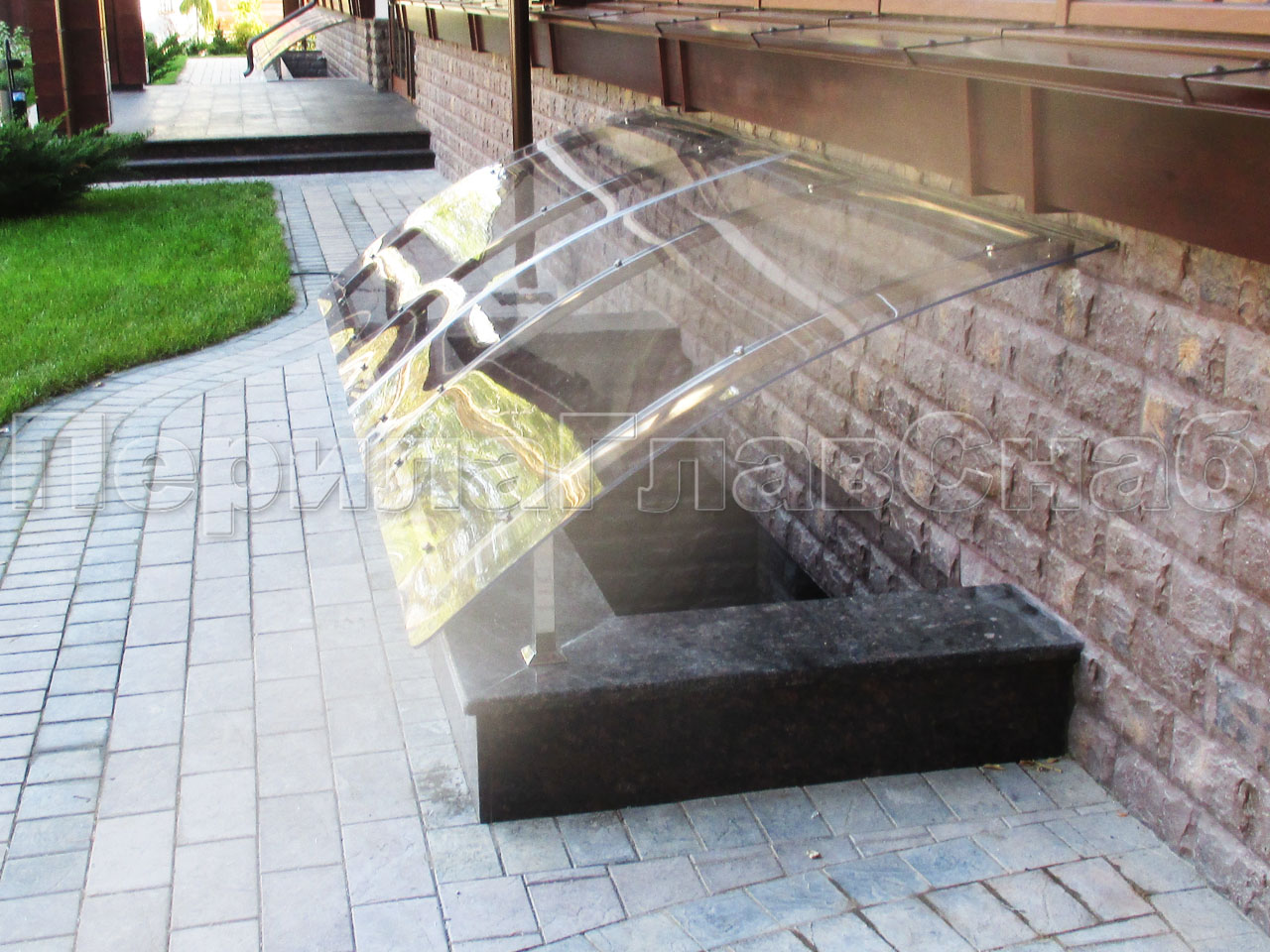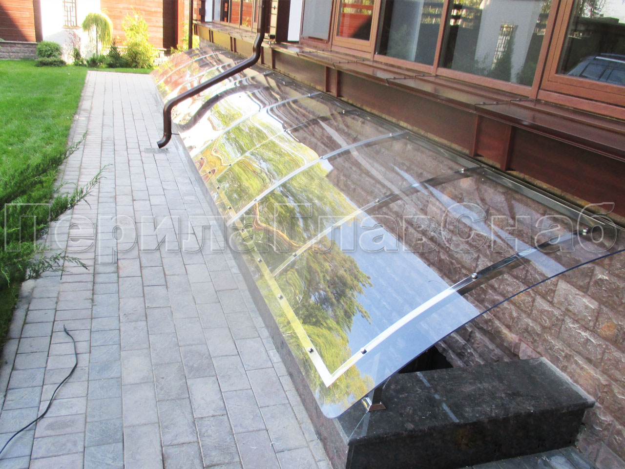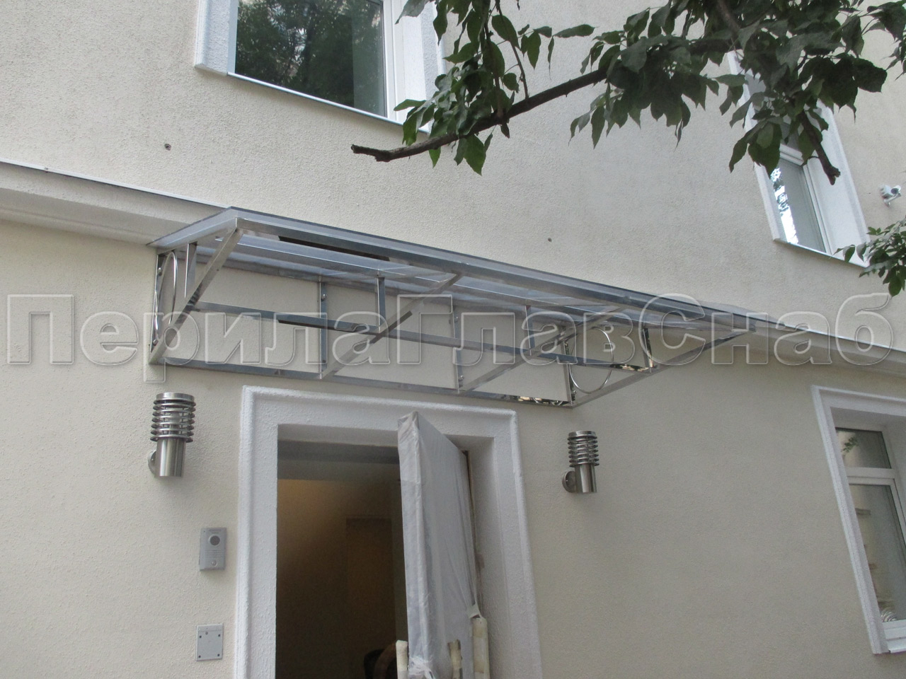 Стеклянный козырек на металлическом каркасе может создаваться из различных видов материала. Полотно может быть: