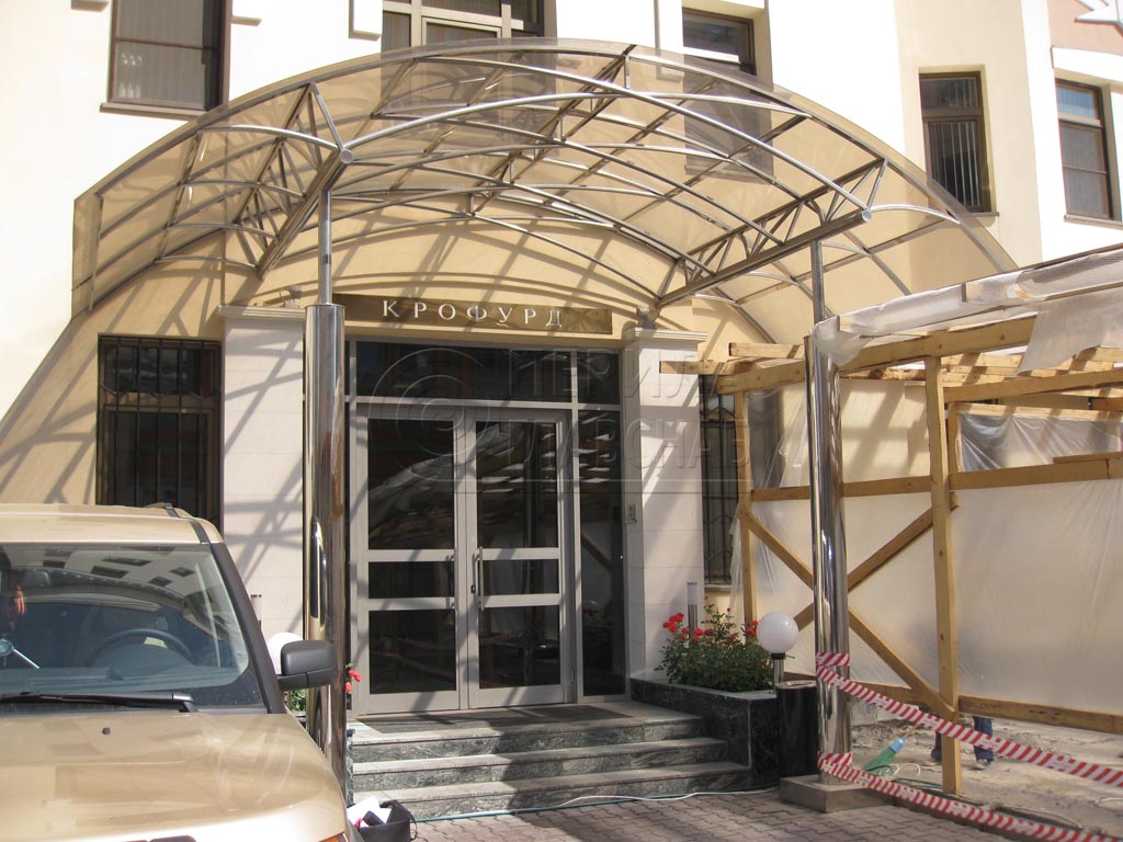 Первым этапом выполнения заказа является проектирование будущей конструкции. В нашей компании имеется большой ассортимент материалов для изготовления каркасов и полотна. Поэтому вы можете заказать любой стеклянный козырек на металлокаркасе.