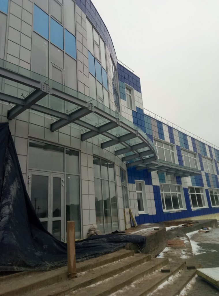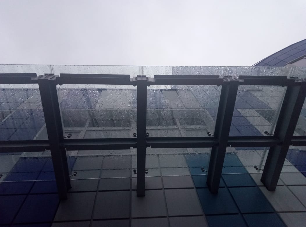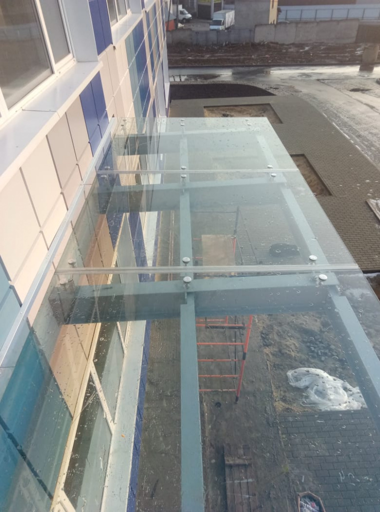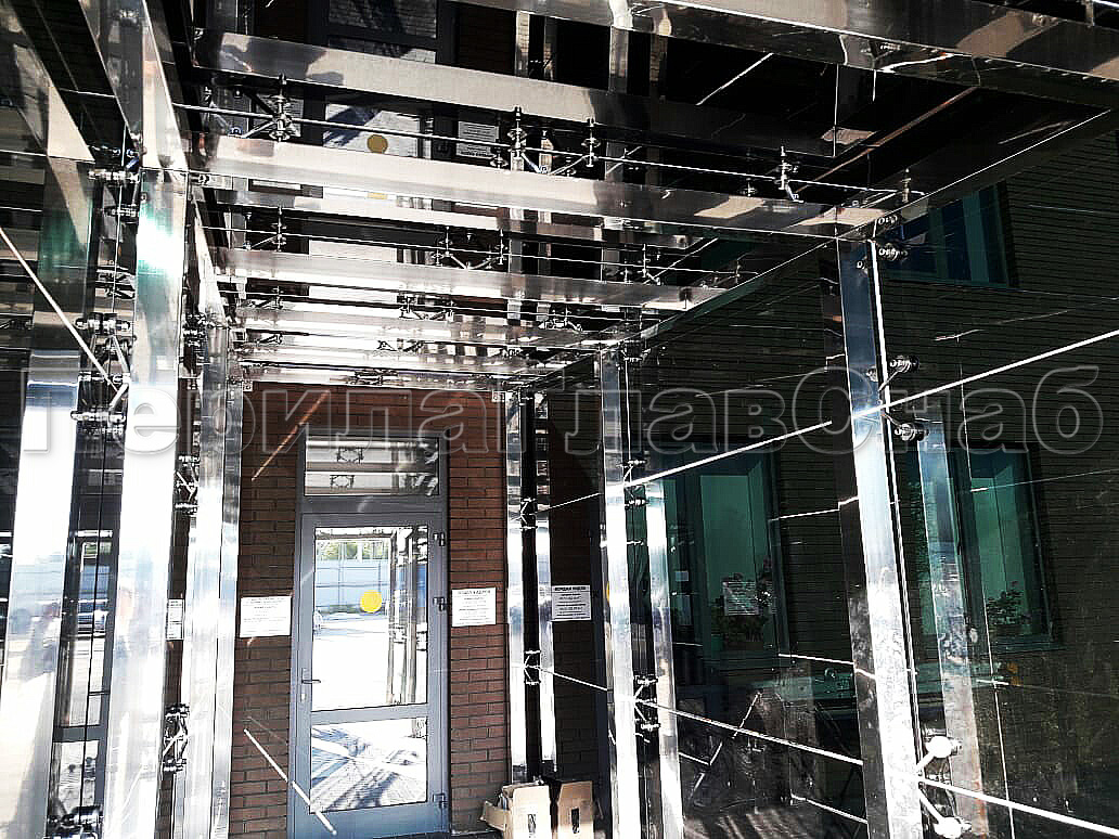 Стеклянный козырек на спайдерах эффективно защищает пространство над входом в здание, не препятствуя проникновению естественного света. Используя различные конфигурации и виды стекла, мы способны точно реализовать практически любой дизайнерский замысел, если это не идет вразрез с технологией производства.