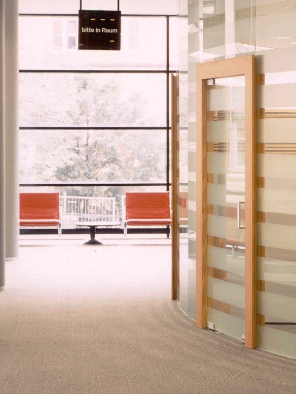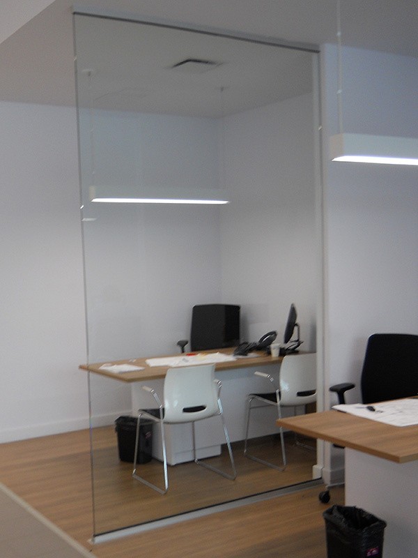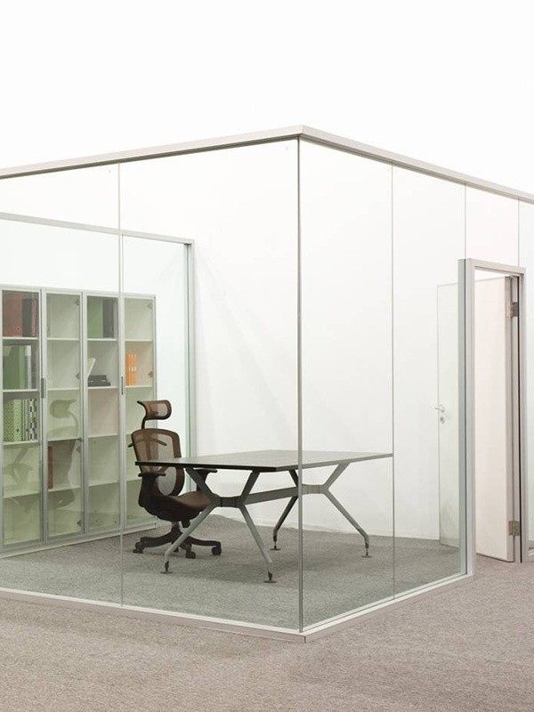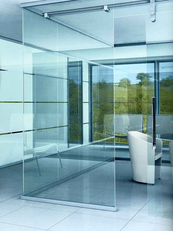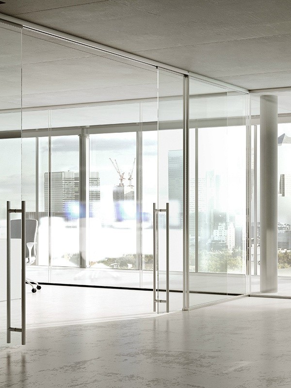 Цельностеклянные перегородки для офиса с распашными и раздвижными дверями