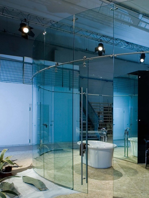 - Точечные. Являются безрамной перегородкой из стекла. Именно на прочный закаленный материал и приходится основная конструктивная нагрузка.