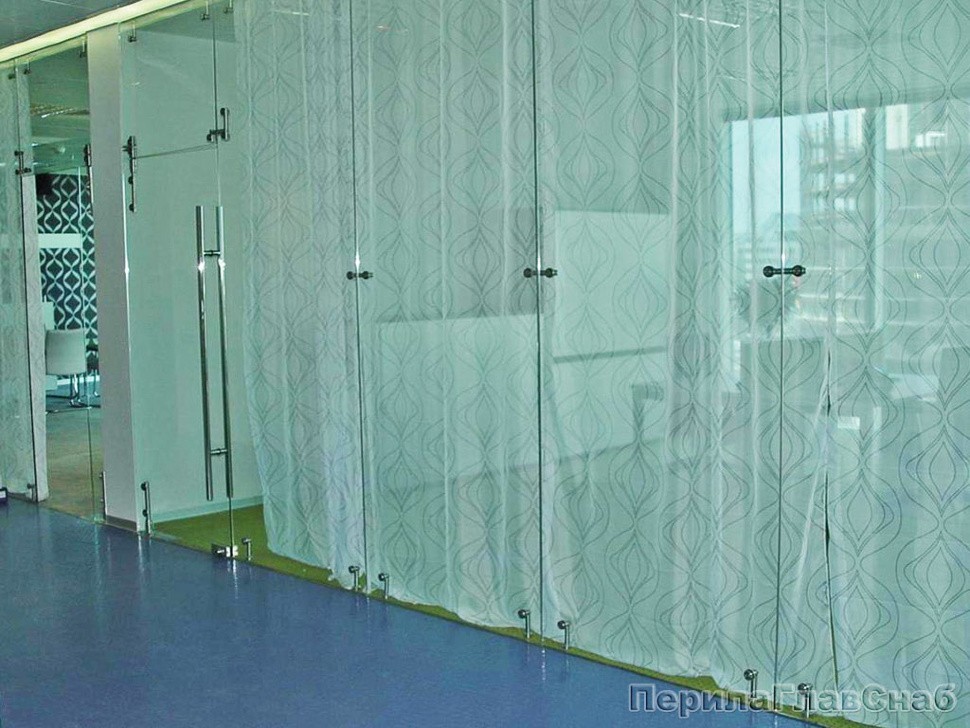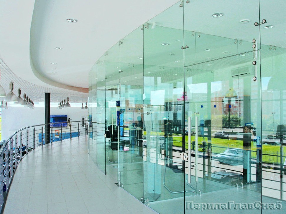 В безрамных стеклянных перегородках для торговых центров можно использовать моллированное (изогнутое стекло). Радиусными могут быть как неподвижные полотна перегородки, так и ее двери.